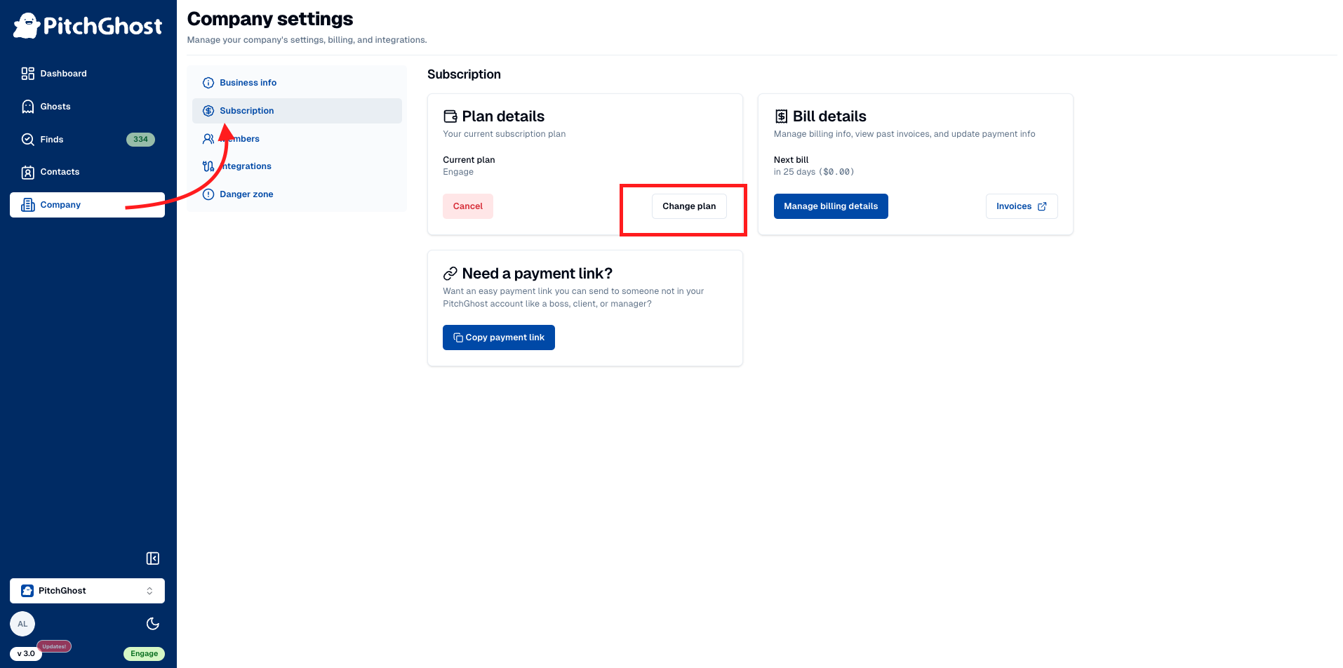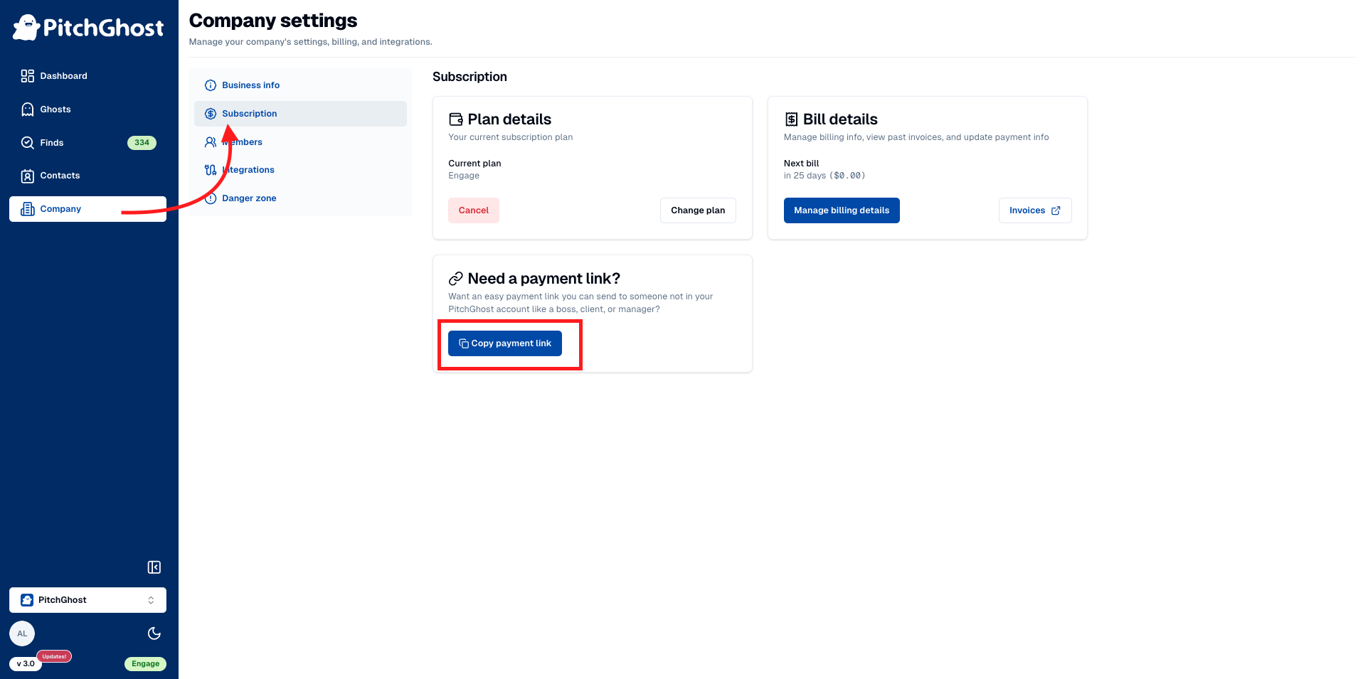 If you need to have someone else in your company pay for your PitchGhost subscription, you can easily send them a payment link which they can use without creating a PitchGhost account.